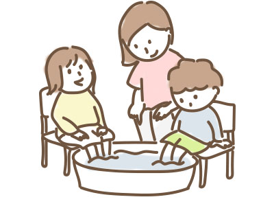 みんなと一緒に足湯につかり、お約束を守りながら落ち着いた時間を過ごします。